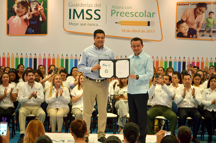 El jefe del Ejecutivo Estatal y el director del Seguro Social presentaron la constancia del primer año de preescolar en las guarderías del Seguro Social, proyectándose posteriormente el video “Hoy las guarderías del IMSS, mejor que nunca’’, agradeciendo a las autoridades, a nombre de los padres de familia, la señora Elba Pecero García por la formación instructivas que recibirán sus hijos gracias a esa certificación.