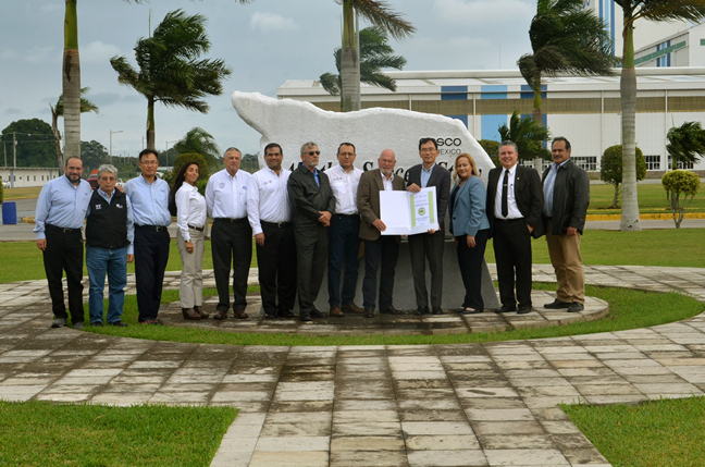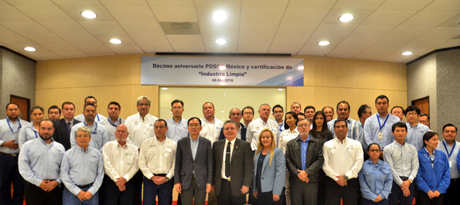 El delegado de la PROFEPA, Aureliano Salinas Peña, y el director de Planeación de esa dependencia, Isaac Quiroz Madrazo, le entregaron al presidente de POSCO México, Hwangbo Won, la certificación de Industria Limpia en México otorgado a esa compañía.
