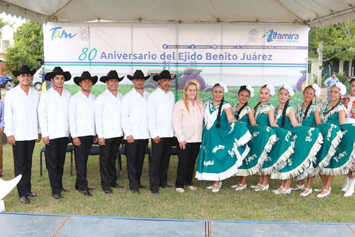 Logrando un cambio con futuro al generar obras, servicios y programas que tienen como finalidad el bienestar y la mejora en la calidad de vida de los altamirenses, la alcaldesa Alma Laura Amparán Cruz refrendó durante la ceremonia del 80 aniversario del ejido Benito Juárez su compromiso de seguir trabajando por Altamira con total responsabilidad, honestidad y transparencia, indicando además que a través de diferentes esquemas se apoya a los productores agropecuarios de la zona rural.
