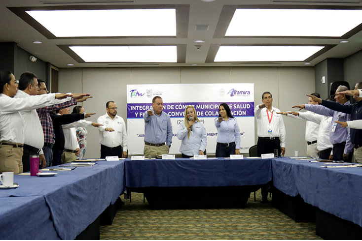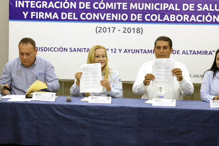 A fin de establecer los acuerdos que permitan la conjunción de esfuerzos institucionales en la solución de problemas de salud pública que afectan a la población, la alcaldesa Alma Laura Amparán Cruz presidió la firma del convenio de colaboración entre el Gobierno Municipal de Altamira y la Jurisdicción Sanitaria Número 12 de la Secretaría de Salud, tomando además la protesta a los integrantes del Comité Municipal de Salud.
