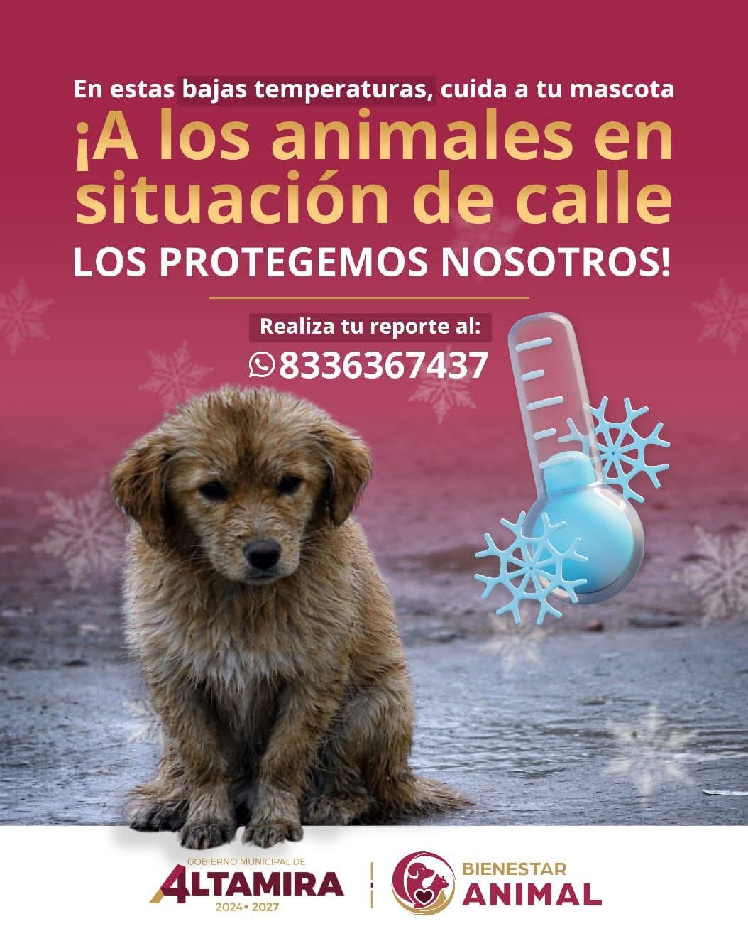 Derivado del descenso de temperatura registrado en la región, el Gobierno Municipal de Altamira activó, a través de la Dirección de Bienestar Animal, un refugio temporal destinado a brindar protección a perros y gatos en situación de calle, priorizando a aquellos que presentan mayor riesgo ante las condiciones climáticas adversas.